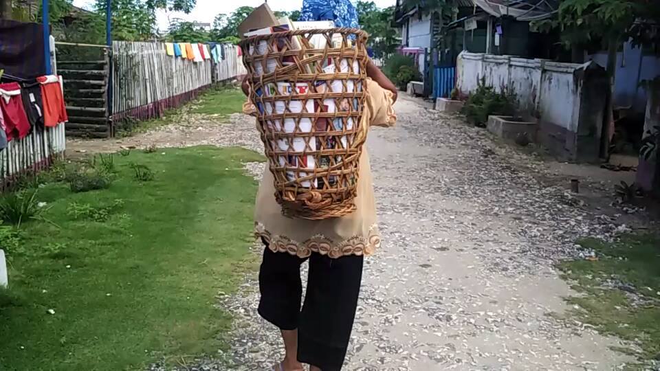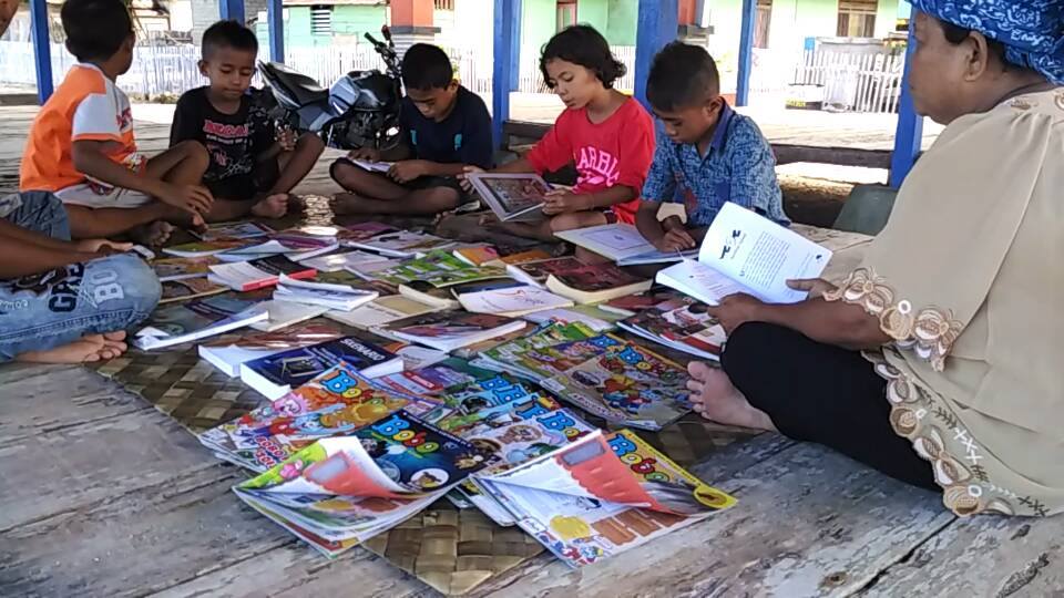 Ibu Mardia, relawan Bois Pustaka di Pulau Lipulalongo, Kabupaten Banggai Laut, keliling desa jalan kaki mengusung bois (keranjang rotan) berisi buku. Setiap minggu beliau mengunjungi satu RT dan menggelar buku mengajak masyarakat membaca ramai-ramai.