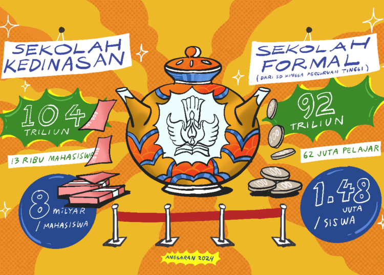 Jadi, anggaran untuk sekolah kedinasan di 2024 mencapai Rp104 triliun, khusus untuk 13 ribu mahasiswa. Sementara itu, untuk 62 juta pelajar di sekolah formal (dari SD sampai perguruan tinggi), alokasinya cuma Rp92 triliun.
