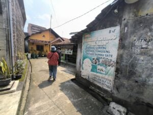Setelah sempat kebablasan, kami akhirnya berhenti di depan sebuah gang gapura bertuliskan “Musholla Khoirul Muttaqin”. Di sampingnya ada satu plang kecil bertuliskan Enthog Pak Badi.